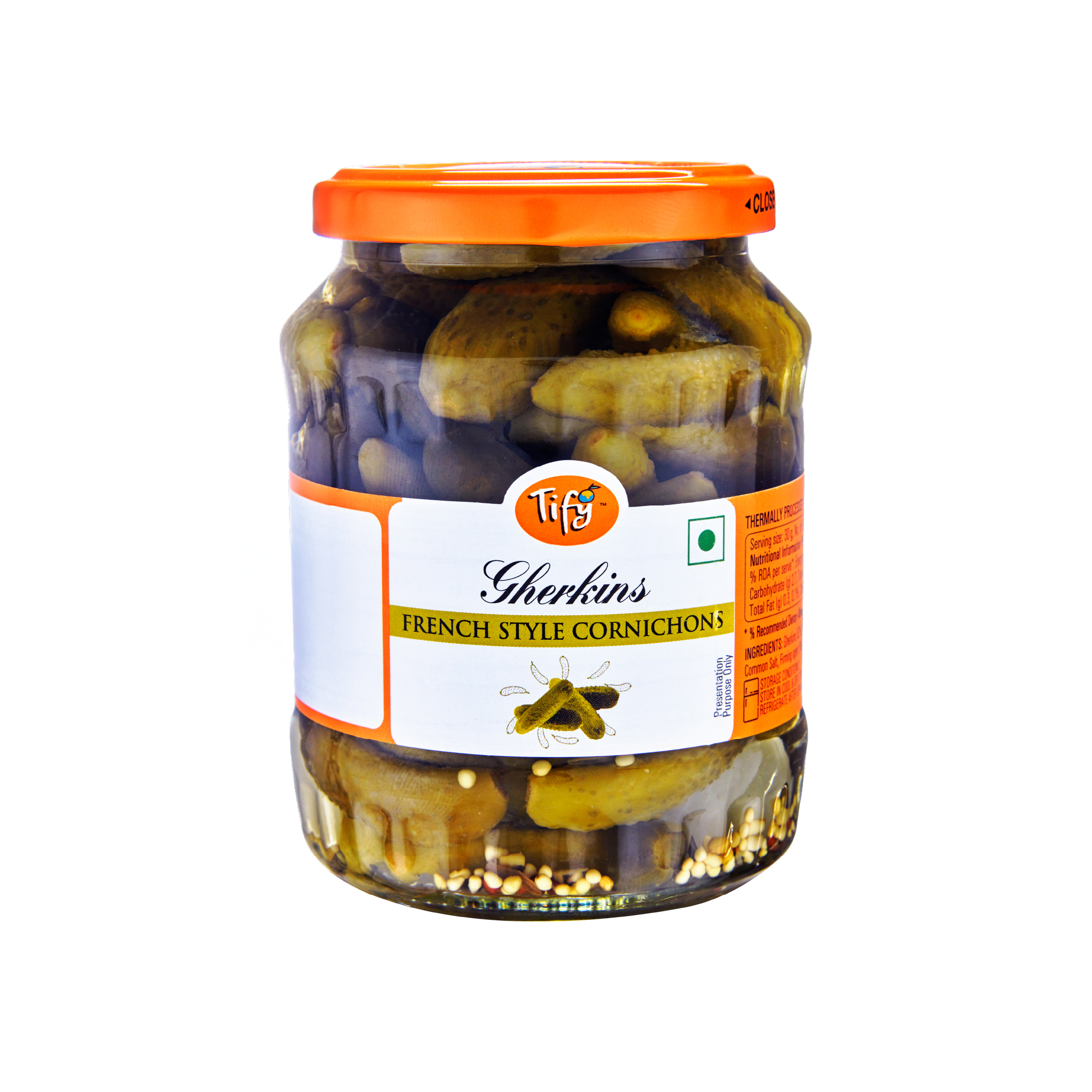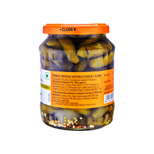 Premium whole gherkins that are thermally processed and preserved in a light 1.5% brine for an authentic French flair. Seasoned with salt, selected spices, and condiments, these cornichons deliver a satisfying crunch and a gentle tang, making them an excellent addition to cheese platters, salads, and sandwiches. Made with 52% gherkins and free from added sugars and cholesterol, they offer a wholesome option for snacking and gourmet cooking alike. Enjoy the crisp texture and true French-style flavor of Cornichons in every bite.