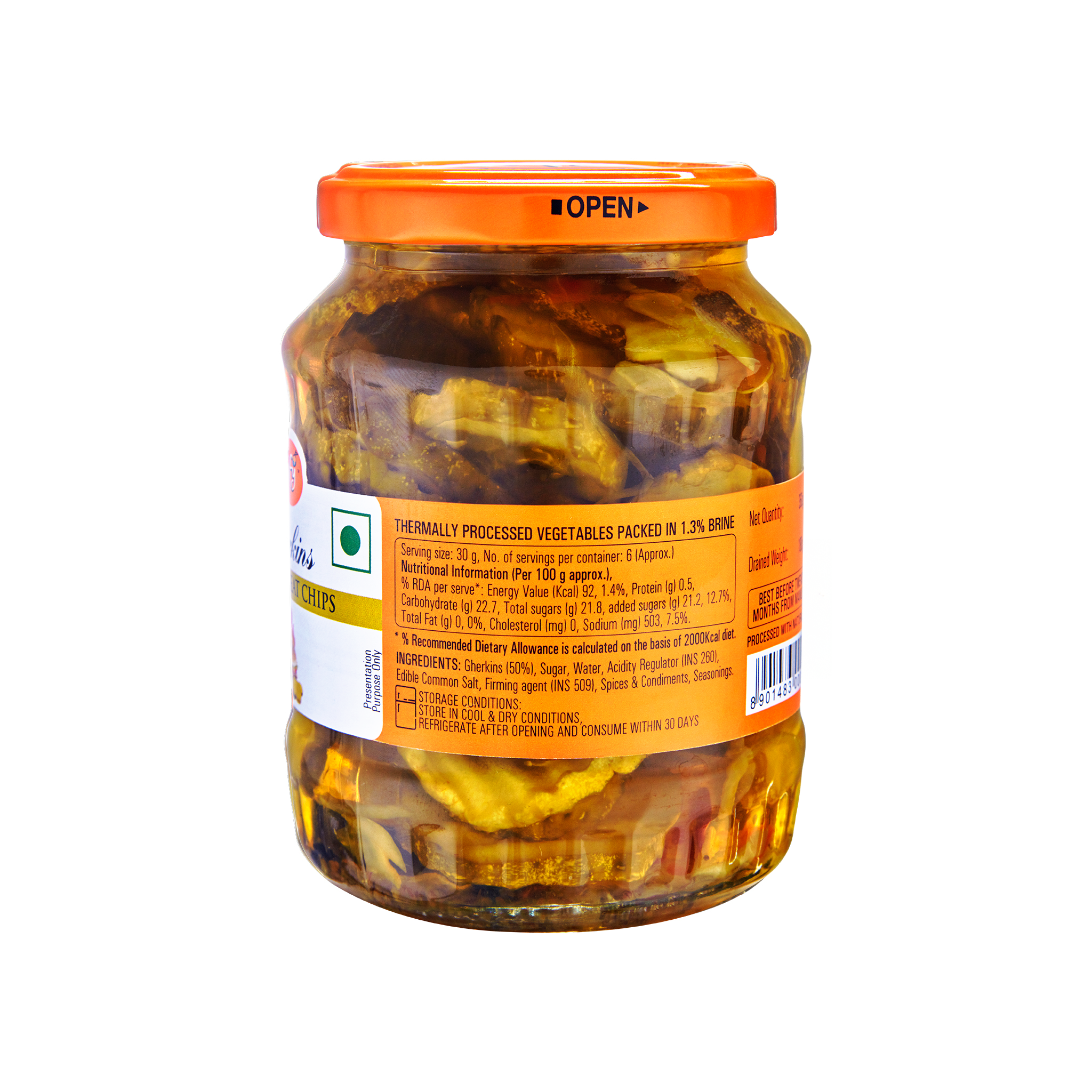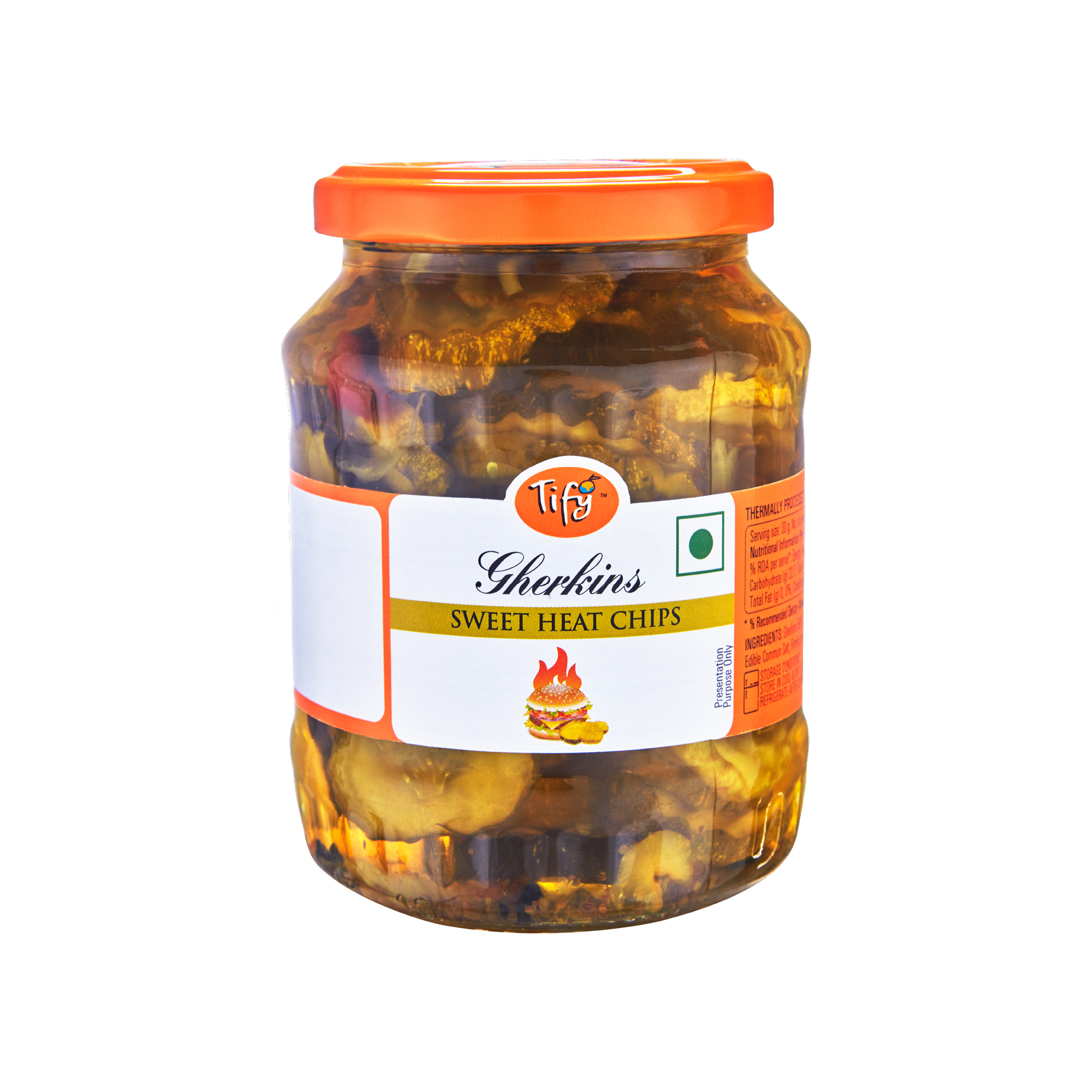 Sliced gherkins with just the right mix of sweetness and spicy warmth, creating a vibrant flavor perfect for snacks or meals. Thermally processed and preserved in 1.3% brine, Retain the freshness and crisp texture with every bite. Seasoned with a blend of sugar, spices, condiments, and natural gherkins, these chips add a bold kick to burgers, sandwiches, salads, or can be enjoyed straight from the jar. With no added cholesterol or trans-fat. Also offers a distinctive, tangy-sweet twist that makes them a favourite for any occasion.